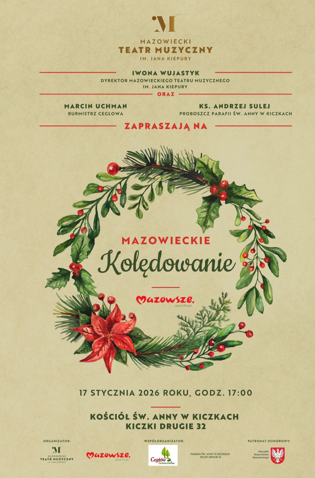 Mazowiecki Teatr Muzyczny im. Jana Kiepury, Burmistrz Marcin Uchman oraz Ksiądz Andrzej Sulej - Proboszcz Parafii św. Anny w Kiczkach, zapraszają na koncert "Mazowieckie Kolędowanie".